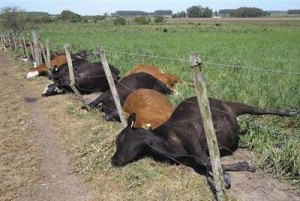 In this picture released by the police department of San Jose, some of the 52 cows that were killed by lightning lie along a fence on a ranch in Valdez Chico village near San Jose, Uruguay, Wednesday, Oct. 22, 2008. The cows were killed when lightning hit the wire fence during a fierce storm, according to police. (AP Photo/San Jose Police Department)