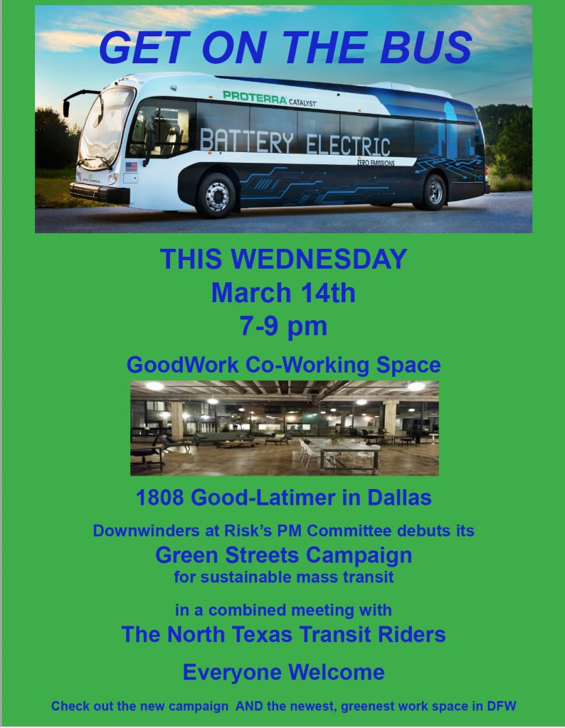 It was all part of a new effort to focus on PM pollution and public transit in preparation for this Wednesday’s combined meeting the the North Texas Transit Riders group. at GoodWork Co-working space, 1808 Good Latimer.